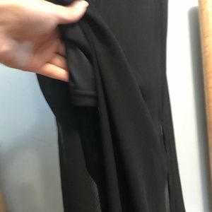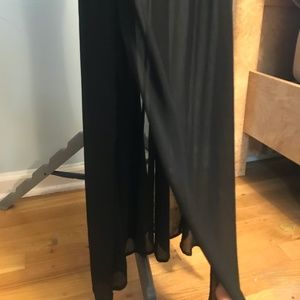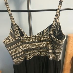 maxi-dress with black/white aztec pattern bodice, sheer skirt with slits each side and black slip layer attached, snap buttons on bodice, adjustable straps, stretchy top at back of bodice, lightly worn in great condition