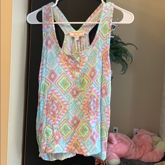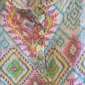 Lightweight cotton tank top with a modified racer back detail. Beautiful pastel Aztec pattern on a white background. Button detail down the front. In great condition.
