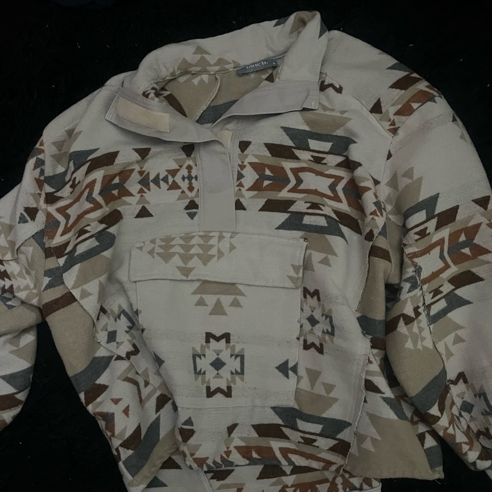 Stylish pullover with an Aztec pattern. Features a front pocket and half-zip design. Perfect for casual wear.