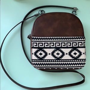 Like new! Only used a few times. Brand is unknown (I bought it from a boutique and the only tag says “made in China.” Dark brown fake leather with black and white Aztec pattern on front. Strap is removable. Inside has one small pocket that fits a phone or credit cards. No stains, excellent condition. Measures 8” tall, 7” across, and 2.5” wide.