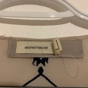 Color is a pink beige tint with navy pattern