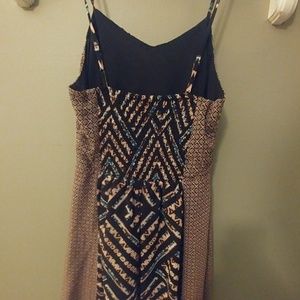 Black, peach, cream, and navy blue pattern. The skirt flares, while the top is form fitting, very cute sundress