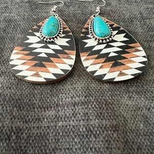 Aztec Pattern Wooden Earrings with Vintage Silver Faux Turquoise Stone NEW