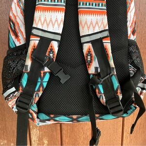 Aztec patterned backpack. Featuring double pockets with interior laptop pocket, dual water bottle holders and padded straps.
