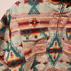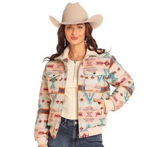 Embrace a bold look with this Aztec patterned bomber jacket. Featuring a blend of cream, red, and blue hues, it's perfect for adding a pop of color to your wardrobe. Jacket is new without tags.