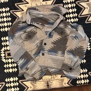 Stylish Aztec patterned button-up jacket. Features shades of gray, blue, and brown.