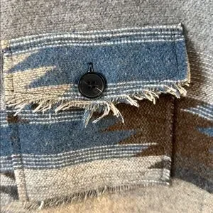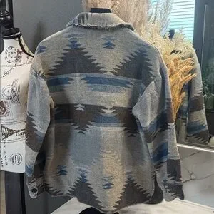 Stylish button-up jacket with an Aztec pattern. Features shades of gray, blue, and black. Perfect for layering.