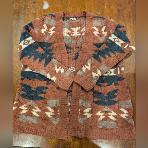 Cozy cardigan with Aztec patterns in brown, black, and cream. Very soft and warm!