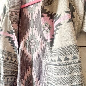 Stylish cardigan with an Aztec pattern. Features shades of pink, gray, and cream.