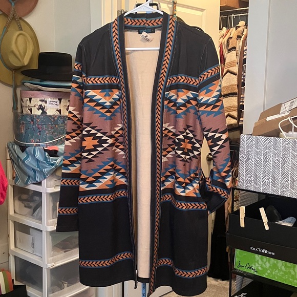 southwestern or Aztec print duster cardigan. This style of open-front, long-length sweater with a geometric pattern is popular in western and boho fashion.