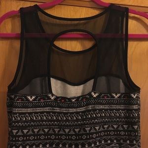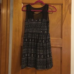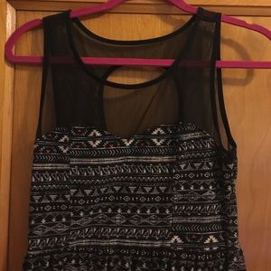 Aztec print dress with a mesh top, and a sweet hear top. Peek-a-boo detail in the back.