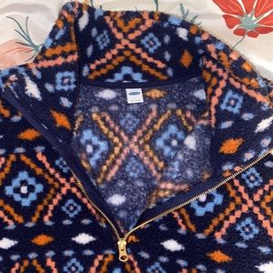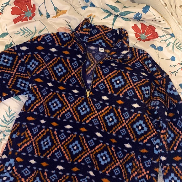The base color is navy blue & the patterns are in orange, white, light blue, & coral!