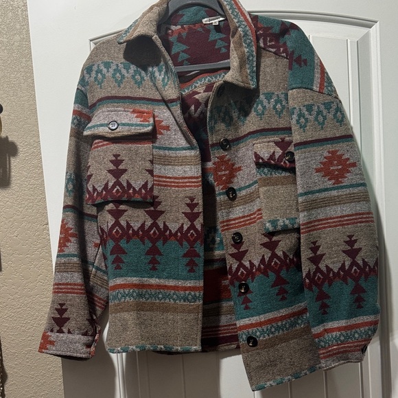 Stylish jacket with a Southwestern pattern. Features a mix of teal, brown, and red colors. Perfect for a casual look. Like new without tags. Great quality purchased from a boutique. Size small. Aztec print.