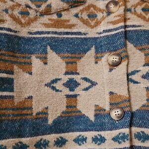 Stylish Aztec patterned jacket with button closure. Features blue and brown tones.