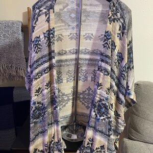 Stylish kimono cardigan with an Aztec pattern. Features shades of blue, gray, and cream.