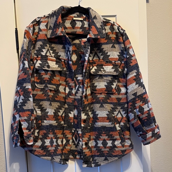 Stylish jacket with an Aztec pattern. Features shades of orange, black, and gray. Pockets.