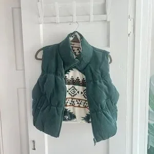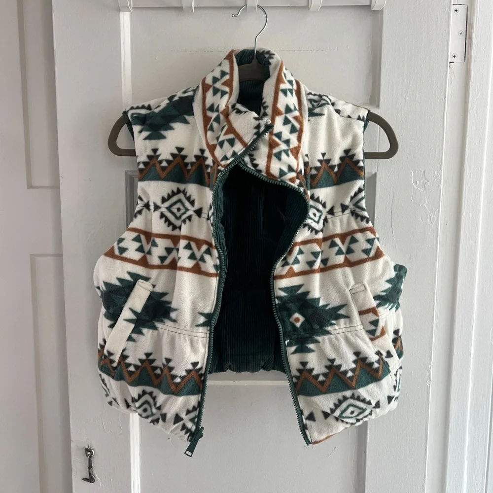 Stylish vest with an Aztec pattern. Features a mix of cream, green, and brown colors. Perfect for layering.