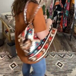 Stylish tote bag featuring a vibrant Aztec pattern. Perfect for adding a pop of color to any outfit.