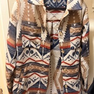 Stylish women's jacket featuring a vibrant Aztec pattern. Perfect for adding a pop of color to your wardrobe.