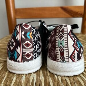 Make a bold statement with these eye-catching slip-on shoes featuring a vibrant Aztec-inspired print in shades of burgundy, teal, black, and white. Designed with comfort and casual flair in mind, these shoes have a lightweight white sole, soft inner lining, and elastic toggle closure for an easy, secure fit.