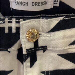 Stylish flare jeans featuring a bold Aztec print in black and white. Perfect for making a statement with any outfit.