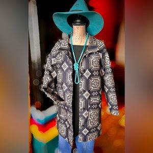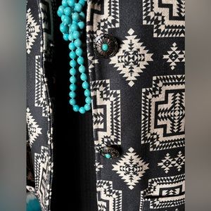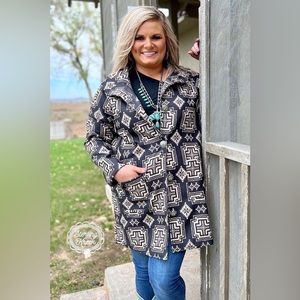 Let's talk classy!! This little number is anything but boring.. Peep the aztec cross print! This jacket is made with a heavy material.. perfect for a chilly night out on the town!! This also features 5 concho style buttons with two front pockets!