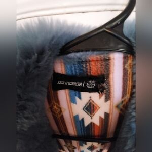 Stylish women's Aztec print long jacket featuring a vibrant pattern with elegant blue faux fur cuffs and collar. Perfect for making a statement.