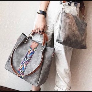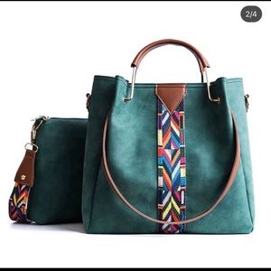 Suede like material. Includes shoulder strap and smaller hand strap.