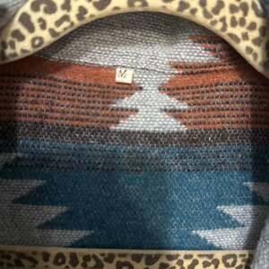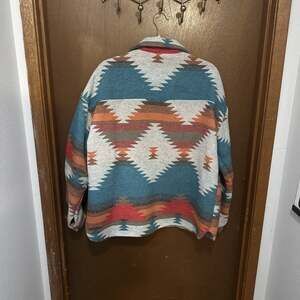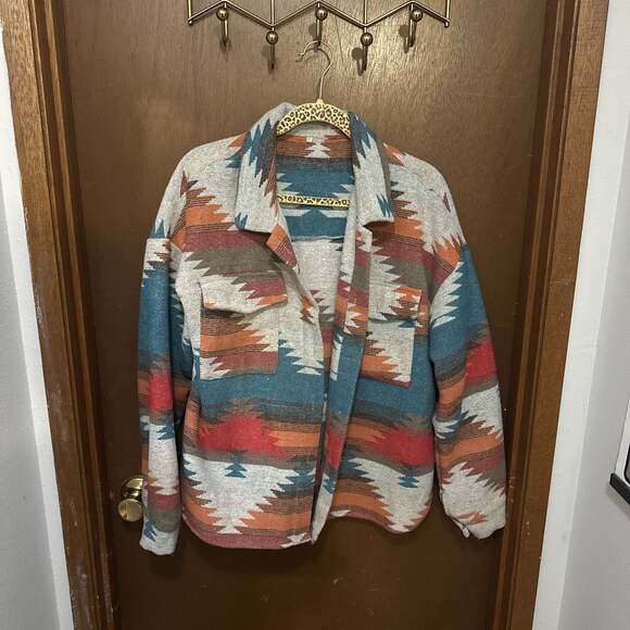 Stylish La Miel Eldora Aztec Print Shacket Jacket, perfect for layering. This shacket features a vibrant Aztec print in shades of red, orange, teal, and gray. It combines the warmth of a jacket with the casual feel of a shirt, making it a versatile addition to any wardrobe. Features front button closure and chest pockets. Excellent pre-owned condition, ready to wear.