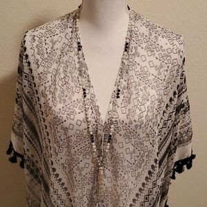 Aztec Print Sheer Black & White Kimono Wrap Cover Up With Tassels OS