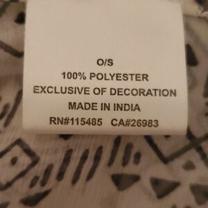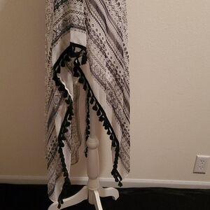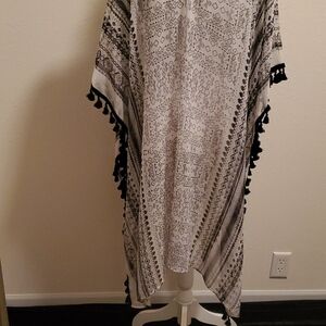 Black & White Aztec pattern cover up with open arm, has black tassels. Can be worn over a bathingsuit also. Length is 46" inches at longest point. Open and Flowing. Fits one size. 100% polyester. Hand wash.