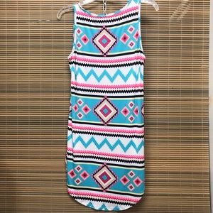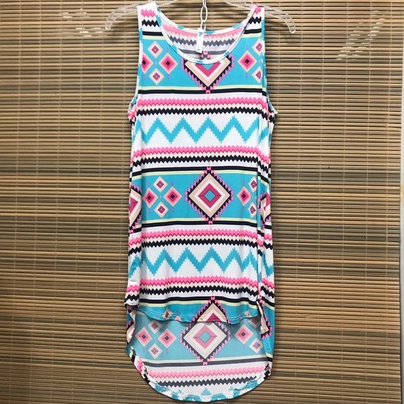 Multi colored Aztec print tank top. Has a very long length. Is super cute and comfortable. Awesome addition to your summer wardrobe. Could also be worn as a swimsuit cover-up.