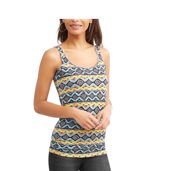 Vibrant Aztec print tank top for women. Features a mix of teal, yellow, and black colors.