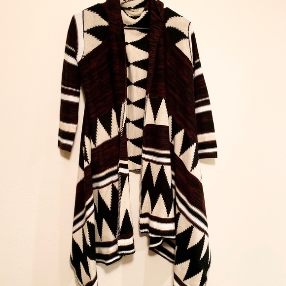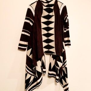 Long Aztec Printed Sweater. The sleeves are short and tight. The front part of the sweater is long in a high-low style. From a smoke-free home. No holes/ropes/stains