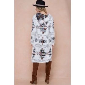 Fuzzy eyelash yarn knit ivory and rainbow aztec tribal pattern jacquard long cardigan blanket sweater