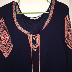 Navy blue 3/4 length sleeve romper with coral accents. The fabric has started to separate in the neck line but can easily be sewn (pictured).
