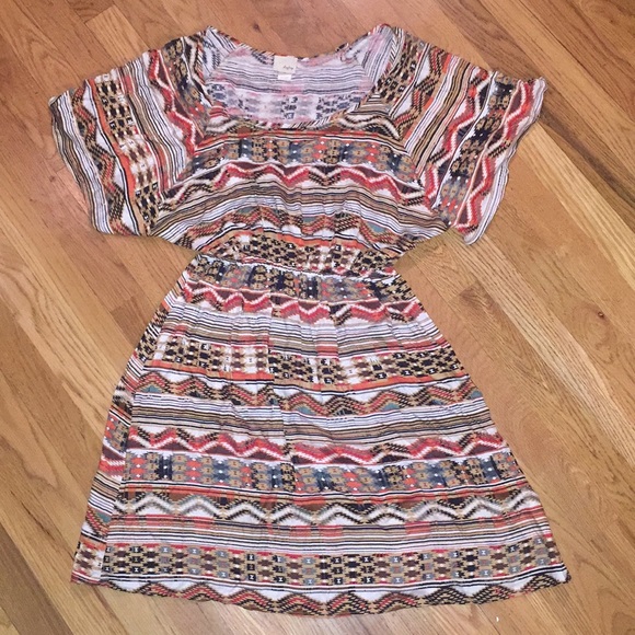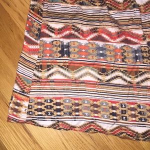 Daytrip brand Aztec romper. Cinched at the waist; multiple colors throughout pattern including maroon, orange, black white, mustard, olive green. Very small hole in neckline as shown in pictures. Easily repairable.
