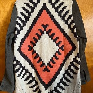 Grey shacket with Aztec print on back. Cinches at the waist.