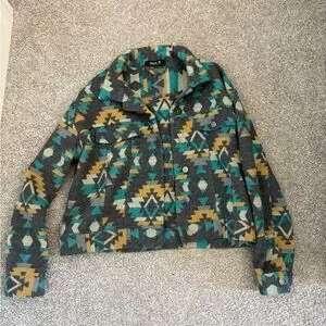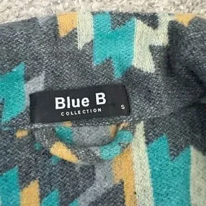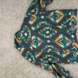 Women’s size Small, but it is oversized in my opinion. More like a medium. Gray base with turquoise and yellow Aztec pattern. Brand new condition.
