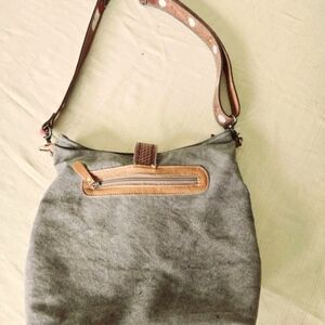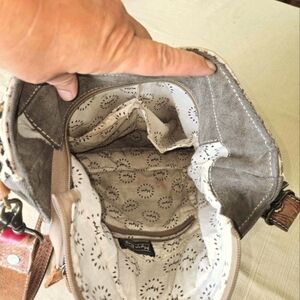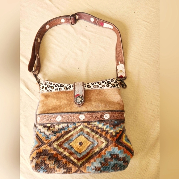 Western ladies shoulder purse. Aztec print and cowhide on the bag with engraved feathers on the strap. Good condition no rips, tears. A little nick in the frabric on the backside bottom right and some wear on the cowhide front panel right side but both not noticeable unless you look closely. Originally $70.