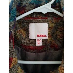 Bongo, Women's Medium, 90s, tribal print, patterned, geometric, long sleeve, coat, red, blue, tan, western, rugged, cozy, outerwear, layering piece, casual , trendy, multicolor, drawstring hem, front pockets, zip button closure, western coat.