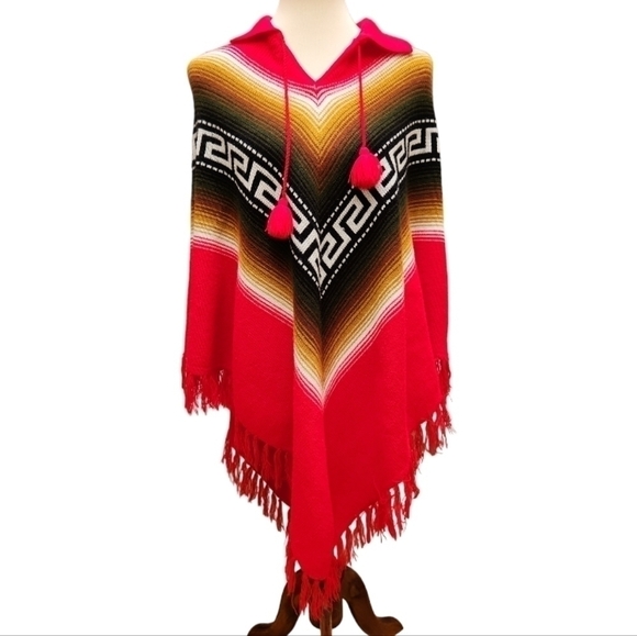 Vintage 1970s Aztec Style Fringed Acrylic Poncho red, black and ombre Browns OS. Super cool poncho. Soft. Due to age there may be small flaws but overall great condition. Poncho does have shaped shoulders. Colors are very bright. Pompom at neck.