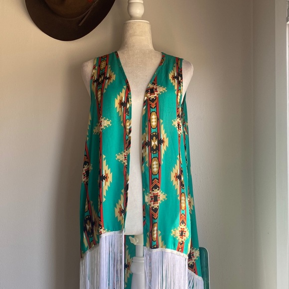 100% Polyester with Fringe. Excellent condition and clean. Non smoking home. Size M/L