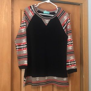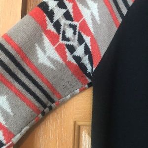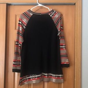 Good used condition. Some pilling under arms (not visible when wearing). Aztec pattern on sleeves & hemline. Black bodice with mid-stretch. Soft & lightweight fabric. Fits true to size.