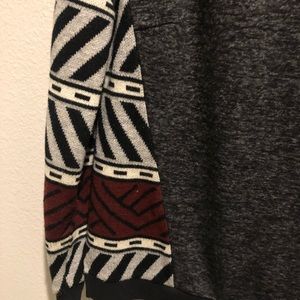 Charcoal crew neck sweater. Black, maroon, and white Aztec detail