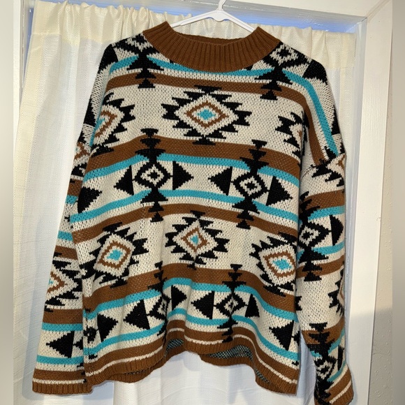 Stay cozy and stylish with this Aztec patterned sweater. Featuring a blend of brown, black, and blue, this sweater is perfect for adding a touch of flair to your wardrobe.