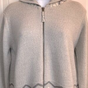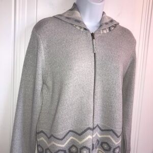 Women’s ACHEGA Portugal Brand gray & white Aztec Tribal print thicker full zip up hooded heavyweight wool/acrylic blend sweater estimated size medium in excellent pre-owned condition.