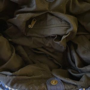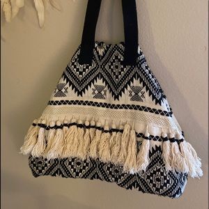 Weekender size in a gorgeous design. 2 ways to carry as you can see in photos. 3 tassels are missing, but I never noticed until I took pics! All over very very clean. Inside fabric is pilling a little, but otherwise in great shape!