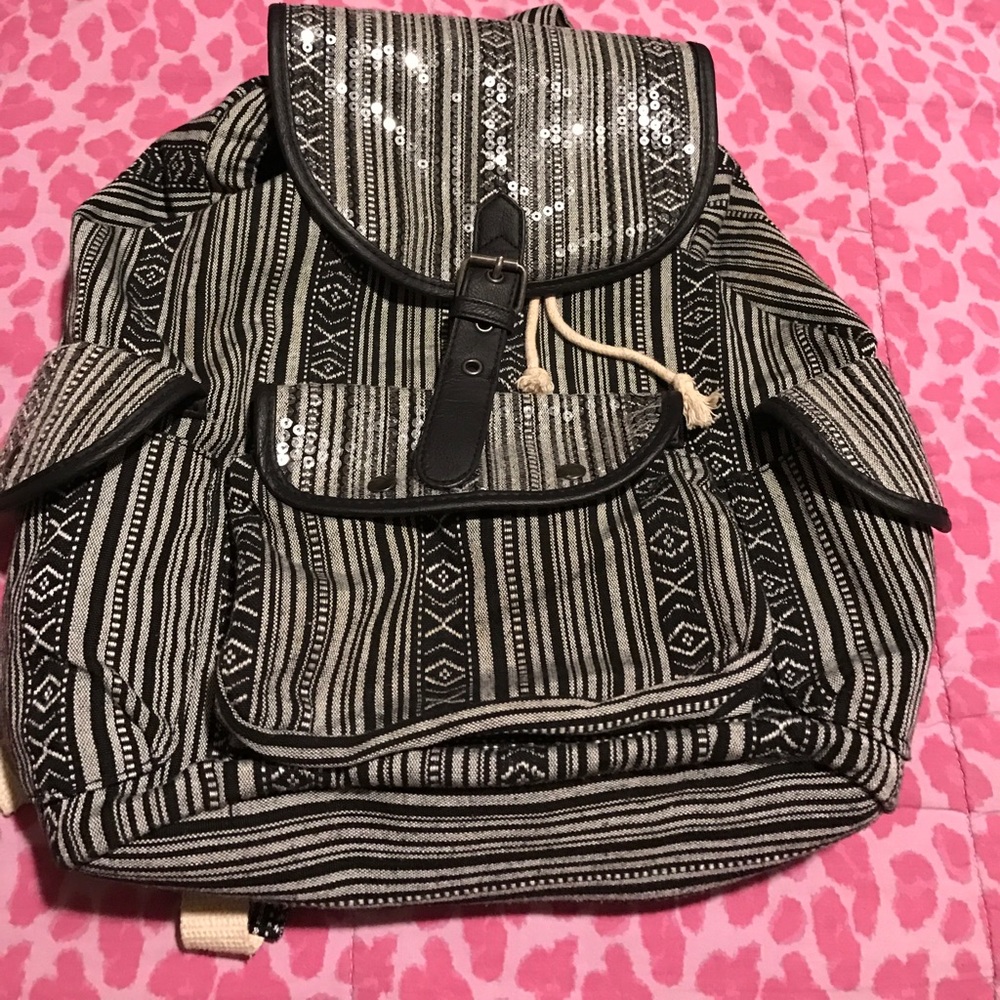 Adorable drawstring back pack with Aztec print! Sequins accent the cute pattern. There is a coffee stain on the strap but could probably be removed