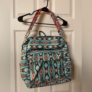 NWOT Turquoise aztec print backpack, colorful shoulder strap included (can be removed), pleather, multiple zip compartments (front, back, inside)